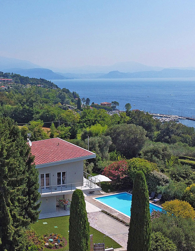 It is arranged on two levels, on the ground floor there is the entrance, three double bedrooms, two bathrooms, a laundry area on the first floor there is a spacious and bright living area with terrace and lake view, modern open kitchen, dining table, sofa for 8 people; a service bathroom and the master bedroom with terrace and lake view with spacious en-suite bathroom. Immersed in a well-kept garden furnished with outdoor dining table and lounge, large swimming pool with diving board equipped with sun loungers and umbrellas.