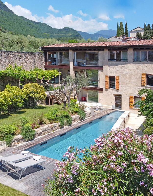 New villa in a gorgeous antique Limonaia with interiors of high design, 10 guests, lake view, AC pool, private garden.