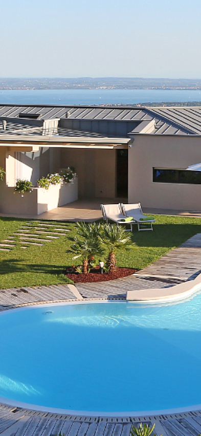 Modern semi-detached Family villa with fantastic lake view, large shared garden with infinity pool and jacuzzi pool.